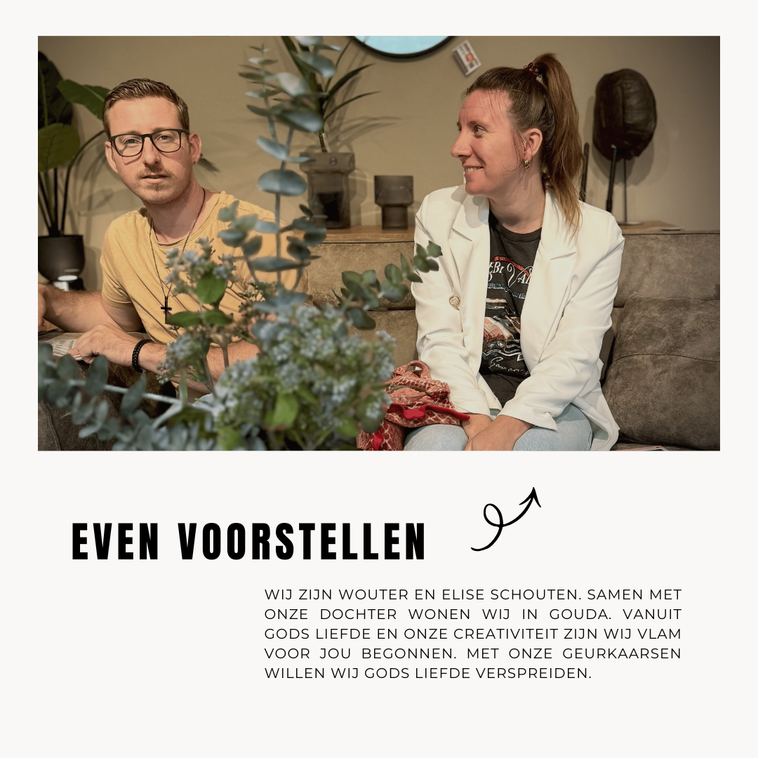 Leuk dat je bent geintreseerd in onze unieke geurkaarsen. Wij zijn Wouter en Elise Schouten en vanuit onze liefde voor God en onze creativiteit zijn wij de christelijke webshop vlamvoorjou.nl begonnen. Of je nu opzoek bent naar een geurkaars om je eigen huis te verrijken of op zoek bent naar een christelijk cadeau voor een vriendin of famillie lid, er zit vast een passend vlammetje voor jou bij. Met liefde maken en ontwikkelen wij zelf al onze geurkaarsen.