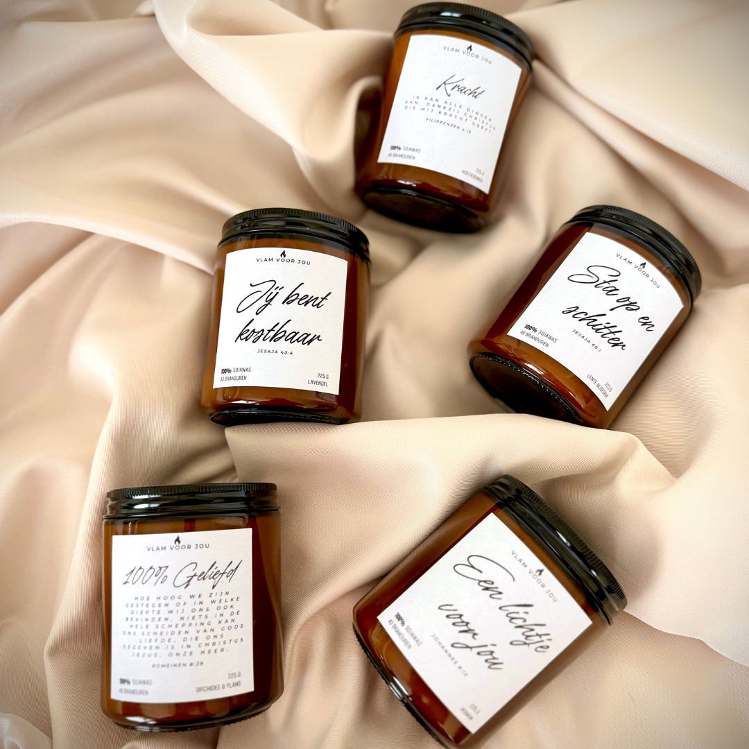 Kaarsen met een Bijbelse bemoediging. Verijk je huis of die van een ander met één van onze heerlijke geurkaarsen.